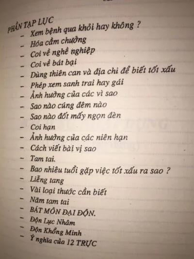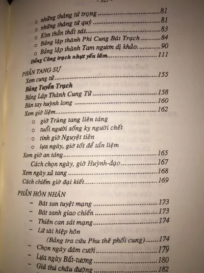Trong 330 trang đầu, sách trình bày những kiến thức về xem ngày tốt xấu, xem tang sự, xem hôn nhân, tu tạo dương trạch, và xem sao chiếu mệnh. 292 trang tiếp theo lại bao gồm các chủ đề cụ thể hơn: xem nghề nghiệp, phép chọn người xuất gia, lữ tài hiệp hôn, ảnh hưởng tốt xấu của sao hạn, thước đo Lỗ Ban, trận đồ Bát Quái,…