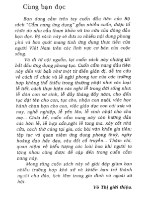 Và đi từ cội nguồn, tại cuốn sách này tác giả bắt đầu ứng dụng phong tục. Cuốn cẩm nang đầu tiên này đến với bạn đọc như một từ điển giản dị, dễ tra cứu về cách tổ chức và lễ nghi phong tục của các trường hợp không thể thiếu trong thường nhật như: các loại lễ tiết, cách thực hiện các nghi lễ trong đời sống như: lễ đón con sơ sinh, tục cho nhận con nuôi, việc học hành chọn bạn cho con, việc giáo dục con cái xưa và nay, nghề nghiệp, lễ yến lão, lễ sinh nhật cho cha mẹ…. Chưa kể, cuốn cẩm nang này còn hướng dẫn các hôn lễ, lễ hợp cẩn, nghi lễ tang ma, xây cất nhà cửa, cách thờ cúng tại gia, các bài văn khấn gia tiên, tập tục và quan niệm ứng dụng phong thuỷ, ngày hoàng đạo hắc đạo, câu đối cổ truyền…. Thậm chí quan niệm về biểu tượng các loài hoa khi người ta tặng nhau cũng được đề cập đến trong cuốn cẩm nang này.