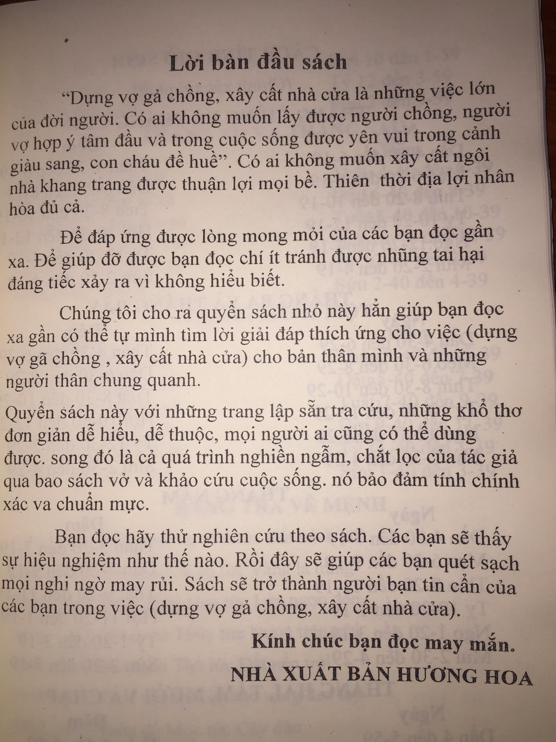 Dựng vợ gả chồng, xây cất nhà cửa là những việc lớn của đời người. Có ai không muốn lấy được người chồng, người vợ hợp ý tâm đầu trong cuộc sống, được yên vui trong cảnh giàu sang, con cháu đề huề. Có ai không muốn khi xây cất ngôi nhà khang trang được thuận lợi mọi bề. Thiên thời, địa lợi, nhân hoà đủ cả. Để đáp ứng được lòng mong mỏi của các bạn đọc gần xa. Để giúp đỡ được bạn đọc chí ít tránh được những tai hại đáng tiếc xảy ra vì không hiểu biết.