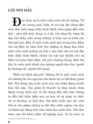 Điều trị bệnh tận gốc không chỉ là một cuốn sách với những lời cầu nguyện cho bệnh tật cơ thể được giảm bớt. Nội dung của cuốn sách này còn chứa đựng nhiều hơn thế nữa. Các phần lý thuyết và thực hành chứa đựng trong sách này có tác dụng dẫn dắt tâm chúng ta đến chỗ thấu hiểu sâu xa hơn về sự sống và cái chết, về vô thường và khổ đau. Sự thấu hiểu sâu sắc như thế sẽ cho phép chúng ta bắt đầu nhìn ngắm cơn đau và bệnh tật bằng một tầm nhìn bao quát hơn. Với tầm nhìn này thì khái niệm về nghiệp quả, về tái sinh và về phẩm chất của sự tái sinh, tát cả những khái niệm đó sẽ mang những ý nghĩa mới có năng lực làm dịu cơn đau và chữa lành tận gốc các căn bệnh của chúng ta