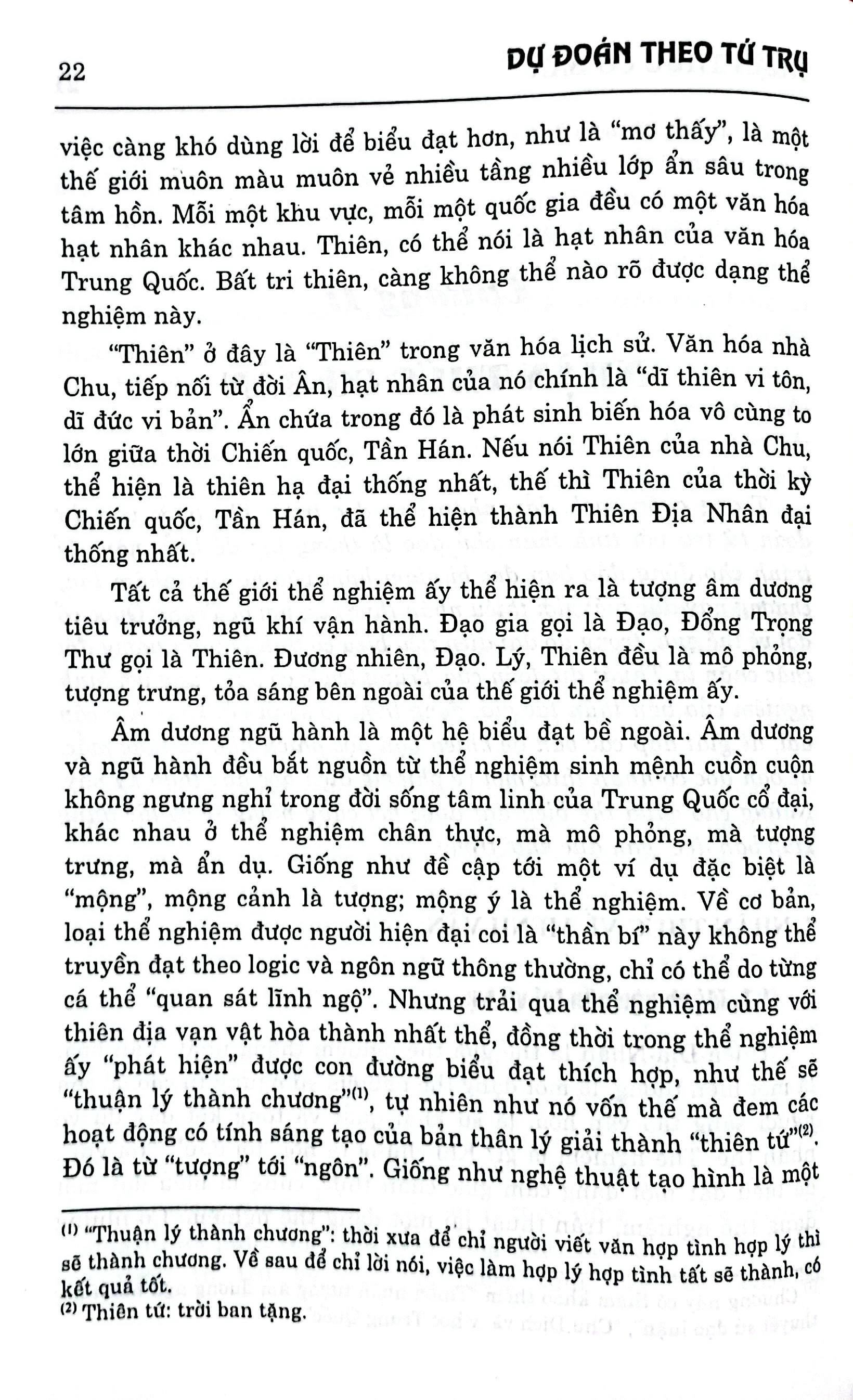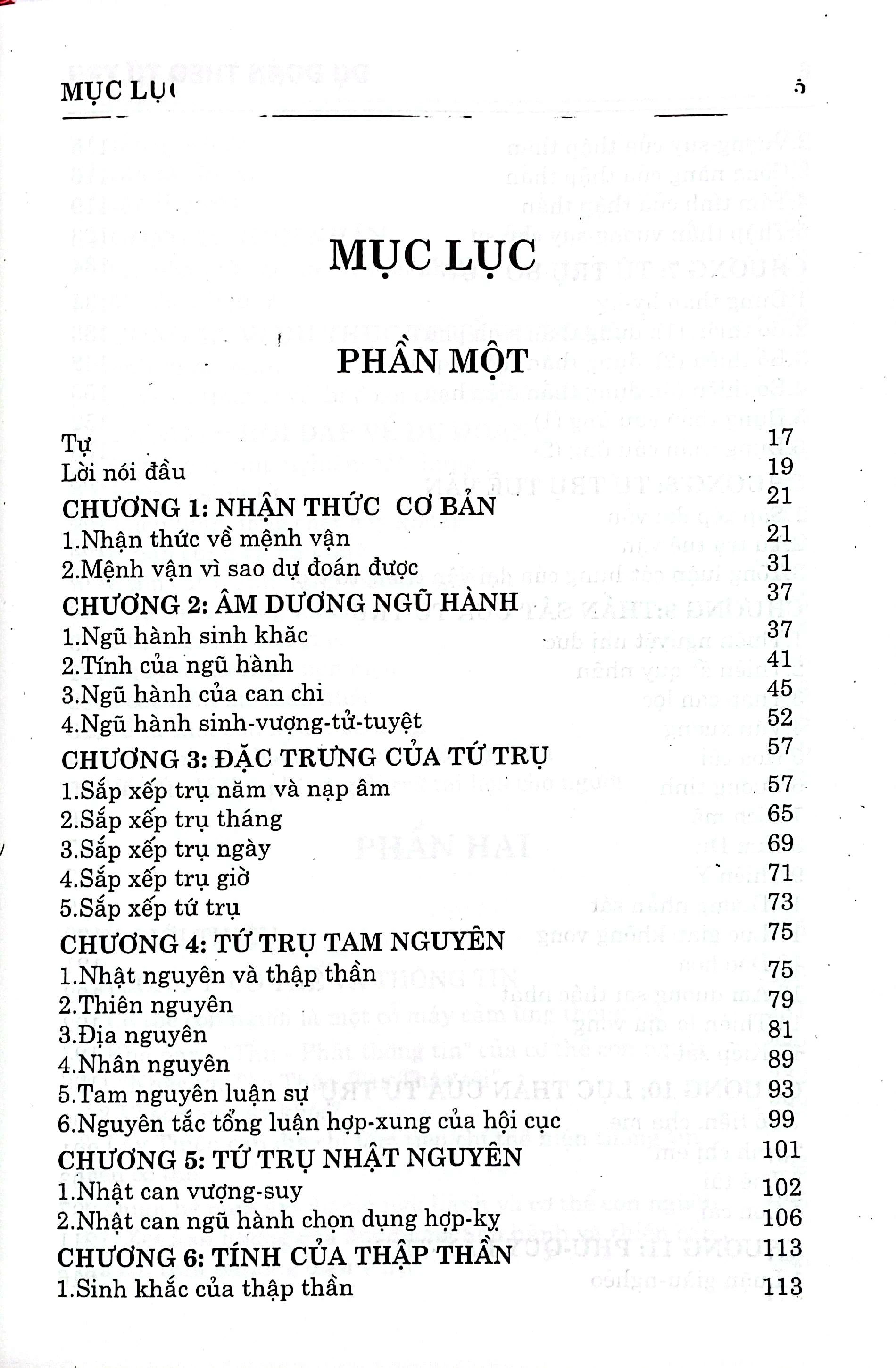 Dự Đoán Theo Tứ Trụ bao gồm 24 chương, so với hai cuốn sách đồng tác giả đã xuất bản trước đây là: Nhập Môn Dự Đoán Theo Tứ Trụ và Dự Đoán Theo Tứ Trụ, thì cuốn sách kinh dịch này có bổ sung thêm: “Cách tính độ vượng, suy của nhật can theo bảng điểm”, một số “cách cục đặc biệt” (chương 11) và một số “Ví dụ thực tế có giải” (Chương 23).