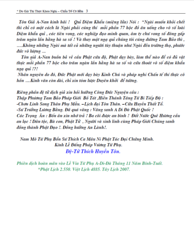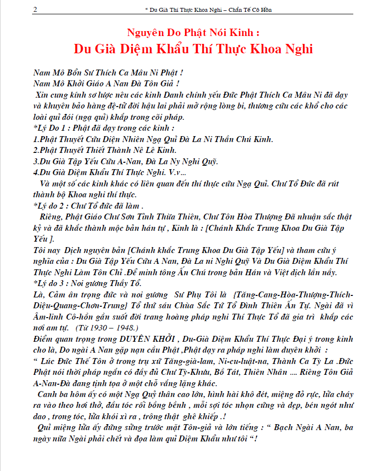 Tôn Giả A Nan kinh hãi. Quỷ Diệm Khẩu nói: “Ngài muốn khỏi chết chỉ có một cách là Ngài phải cúng thí mỗi phần 77 hộc đồ ăn uống cho vô số loài Diệm Khẩu quỷ, các tiên vong, các nghiệp đạo minh quan, âm ty chư vong số đông gấp trăm ngàn lần hằng hà sa số!
