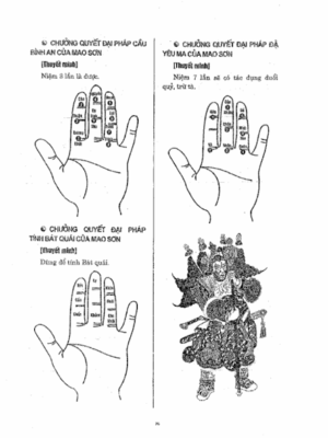 Luyện cương thi ( luyện xác chết thành thi biến nhằm mục đích đưa về quê an táng)…Ngoài những pháp thuật kể trên Mao Sơn còn có những trận pháp vô cùng huyền diệu như: Cửu đăng liên hoa trận, cửu tiền bôi đỉnh trận, bát quái trận,…
