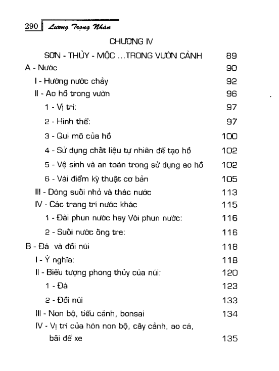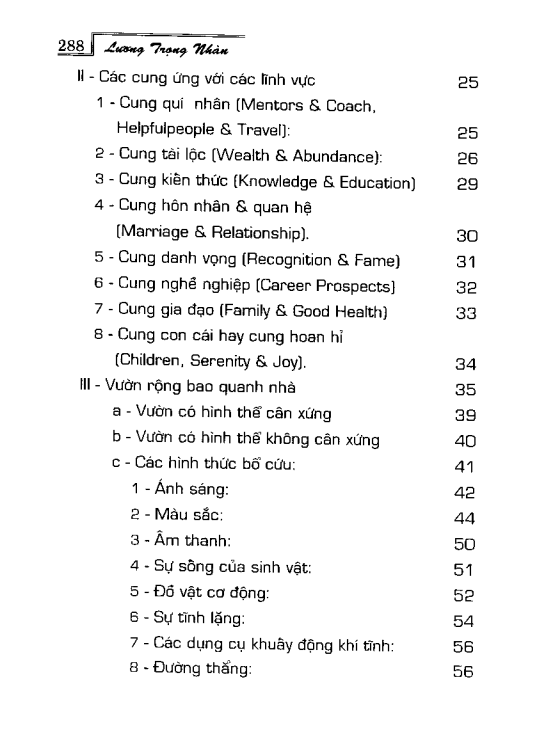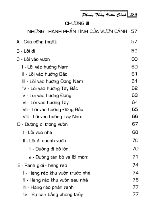 Đặc biệt, cuốn sách còn trình bày chi tiết các nhân tố cấu thành nên “Phong thủy vườn cảnh” lý tưởng, như: Cổng vào, lối đi, lối vào vườn, đường đi trong vườn và hàng rào. Đây là phần phục vụ đắc lực cho những độc giả quan tâm, nghiên cứu về cảnh quan sân vườn không thể bỏ qua.