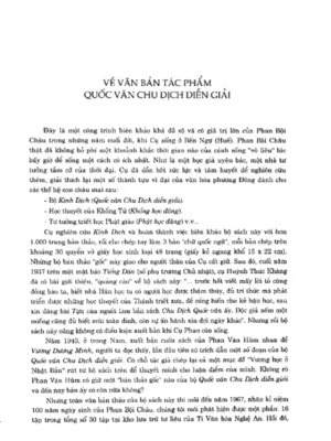 Quốc Văn Chu Dịch Diễn Giải là một công trình biên khảo khá đồ sộ và có giá trị lớn của Phan Bội Châu trong những năm cuối đời, khi Cụ sống ở Bến Ngự (Huế). Phan Bội Châu thật đã không bỏ phí một khoảnh khắc thời gian nào của cảnh sống “vô liêu” lúc bấy giờ để sống một cách có ích nhất. Như là một học giả uyên bác, một nhà tư tưởng tầm cỡ của thời đại. cụ đã dồn hết sức lực và tâm huyết để nghiên cứu thêm, giải thích lại một số thành tựu vĩ đại của văn hóa phương Đông dành cho các thế hệ con cháu mai sau: