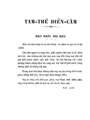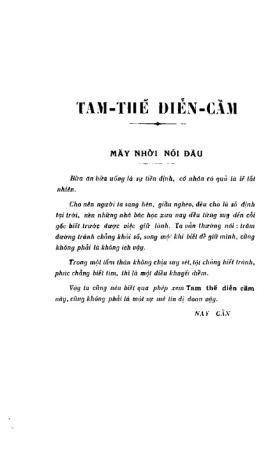 Trong một tấm thân không chịu suy xét, tội chẳng biết tránh, phúc chẳng biết tìm, thì là một điều khuyết điểm. Vậy mỗi người cũng nên biết qua phép xem Tam thế diễn cầm này, để dự lành đoán dữ, đón nhận những điều tốt mà tránh những điều xấu sẽ diễn ra.