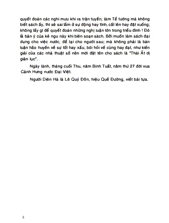 Không lấy gì mà quyết đoán các nghi mưu khi ra trận tuyến; làm Tể tướng mà không biết sách ấy, thì sẽ sai lầm ở sự động hay tĩnh, cất lên hay đặt xuống; không lấy gì để quyết đoán những nghị luận lớn trong triều đình ! Đó là bản ý của kẻ ngu này khi biên soạn sách. Bởi muốn làm sách đại dụng cho việc nước, để lại cho người sau; mà không phải là bàn luận hão huyền về sự tốt hay xấu, bỏi hỏi về cùng hay đạt, như kiến giải của các nhà thuật số nên mới đặt tên cho sách là “Thái Ất dị giản lục”.