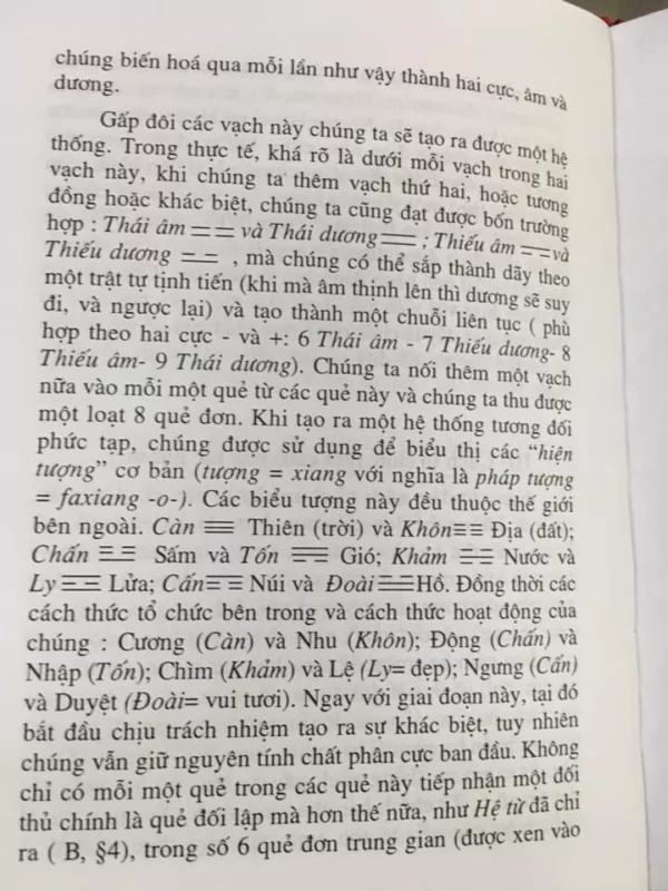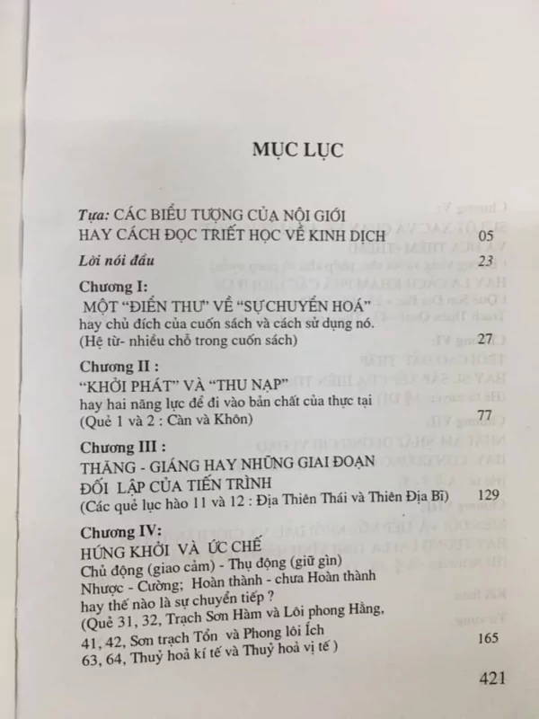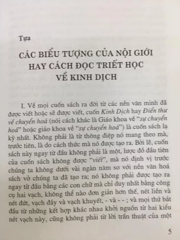 Về mọi cuốn sách ra đời từ các nền văn minh đã được viết hoặc sẽ được viết, cuốn “kinh dịch hay điển thư về chuyển hoá” là cuốn sách lạ kỳ nhất. Không phải là từ thông điệp nó mang theo mà, trước tiên, là do cách thức mà nó được tạo ra. Bởi lẽ, cuốn sách Các Biểu Tượng Của Nội Giới Hay Cách Đọc Triết Học Về Kinh Dịch này ngay từ đầu không phải là một lược đồ đầu tiên của cuốn sách không được “viết”, mà nó định vị trước chúng ta không dưới vài ngàn năm so với nền văn hoá sách vở chúng ta đã tạo ra; nó không phải được tạo ra ngay từ đầu bằng các con chữ mà chỉ duy nhất bằng công cụ hai vạch, không thể nào đơn giản hơn thế, nét liền và nét đứt, vạch đầy và vạch khuyết, và mọi thứ bắt đầu từ những kết hợp khác nhau khởi nguồn từ hai kiểu nết vạch này, cũng không phải từ lời trần thuật của một diễn ngôn, từ sự trình bày một nghĩa, mà văn bản của nó được hình thành.