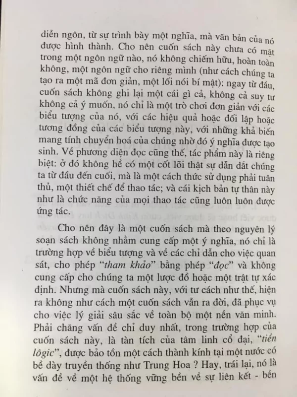 Cho nên đây là một cuốn sách mà theo nguyên lý soạn sách không nhằm cung cấp một ý nghĩa, nó chỉ là trường hợp về các chỉ dẫn cho việc quan sát, cho phép “tham khảo” bằng phép “đọc” và không cung cấp cho chúng ta một lượt đồ hoặc một trật tự xác định. Nhưng mà cuốn sách này, với tư cách như thế, hiện ra không như cách một cuốn sách vẫn ra đời, đã phục vụ cho việc lý giải sâu sắc về toàn bộ một nền văn minh. Phải chăng vấn đề duy nhất, trong trường hợp của cuốn sách này, là tàn tích của tâm linh cổ đại, “tiền lôgic”, được bảo tồn một cách thành kính tại một nước có bề dày truyền thống như Trung Hoa? Hay, trái lại, nó là vấn đề về một hệ thống vững bền về sự liên kết – bền vững tới mức mà nó tự phát triển, cho tới chúng ta?