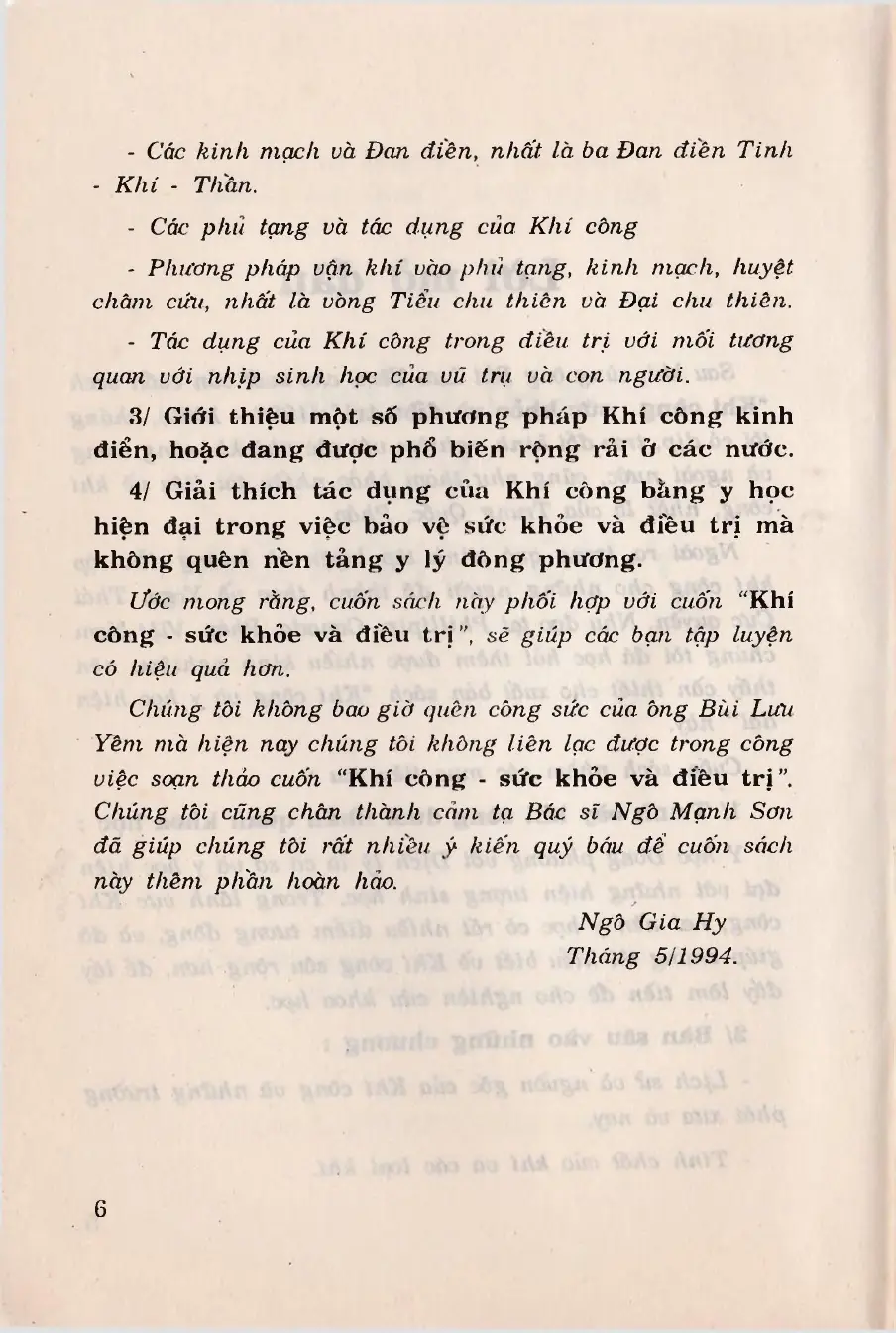 Ngoài ra, trong quá trình tập luyện và hướng dẫn tập khí công cho những người đã thành thạo về Yoga, Thái Cực quyền, Nhu đạo tại Phillippin, Canada, Pháp, Việt Nam chúng tôi đã học hỏi thêm được nhiều kinh nghiệm, nên thấy cần thiết cho xuất bản sách “Khí công và y học hiện đại” này.