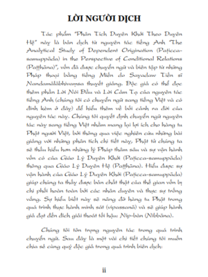 Tác phẩm “Phân Tích Duyên Khởi Theo Duyên Hệ” này là bản dịch từ nguyên tác tiếng Anh “The Analytical Study of Dependent Origination (Paṭicca[1]samuppāda) in the Perspective of Conditional Relations (Paṭṭhāna)”, vốn đã được chuyển ngữ và biên tập từ những Pháp thoại bằng tiếng Miến do Sayadaw Tiến sĩ Nandamālābhivaṃsa thuyết giảng. Độc giả có thể đọc thêm phần Lời Nói Đầu và Lời Cảm Tạ của nguyên tác tiếng Anh (chúng tôi có chuyển ngữ sang tiếng Việt và có đính kèm ở đây) để hiểu thêm về bối cảnh ra đời của nguyên tác này. Chúng tôi quyết định chuyển ngữ nguyên tác này sang tiếng Việt nhằm mang lại lợi ích cho hàng tu Phật người Việt, bởi thông qua việc nghiên cứu những bài giảng với những phân tích chi tiết này, Phật tử chúng ta sẽ thấu hiểu hơn những lý Pháp thâm sâu và sự vận hành vốn có của Giáo Lý Duyên Khởi (Paṭicca-samuppāda) thông qua Giáo Lý Duyên Hệ (Paṭṭhāna). Hiểu được sự vận hành của Giáo Lý Duyên Khởi (Paṭicca-samuppāda) giúp chúng ta thấy được bản chất thật của thế gian vốn bị chi phối hoàn toàn bởi các nhân duyên và thực sự trống vắng. Sự hiểu biết này sẽ nâng đỡ hàng tu Phật trong quá trình thực hành minh sát (vipassanā) và sẽ giúp hành giả đạt đến đích giải thoát tối hậu: Níp-bàn (Nibbāna)