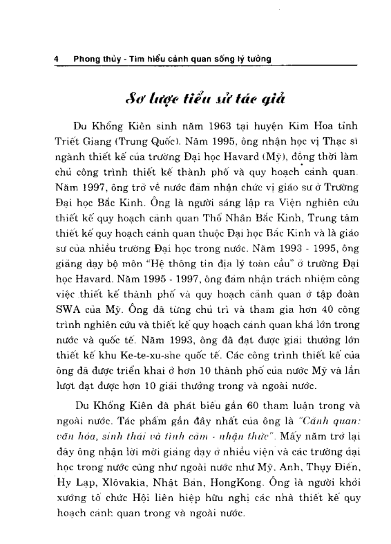 Từ những lời giới thiệu sơ lược trên, chúng ta có thể thấy được chỗ khác nhau giữa đặc điểm của quyển sách này và những tác phẩm khác. Đây là một quyển sách đáng đọc. Quyển sách này không dài nhưng lời văn giản dị. hình ảnh chủ thích đầy đủ. Theo tôi hiểu, sự nghiên cứu của tác giả không đơn thuần chỉ là tìm hiểu ý nghĩa sâu xa của thuyết phong thủy, mà còn muốn thể hiện trong thực tiễn công việc thiết kế và quy hoạch cảnh quan của mình để phát huy chân lý của văn hóa truyền thống Trung Quốc. Tôi đã thấy nhiều sáng tạo mới của tác giả. Trên phương diện này, tôi hy vọng sau khi tác phẩm này xuất bản không lâu sẽ tiếp tục xuất bản những tác phẩm mới về cảnh quan lý tưởng của ông.
